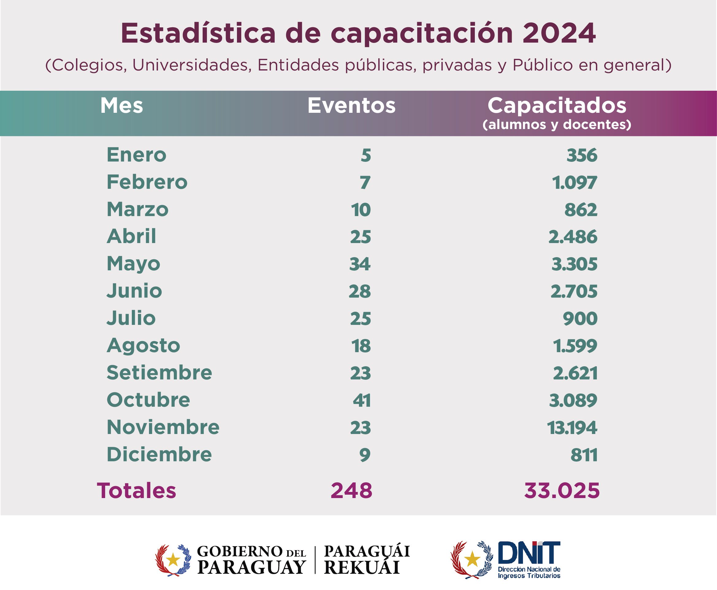 Estadística de Capacitación a Colegios, Universidades, Entidades Públicas, Privadas y Público en General Año 2024