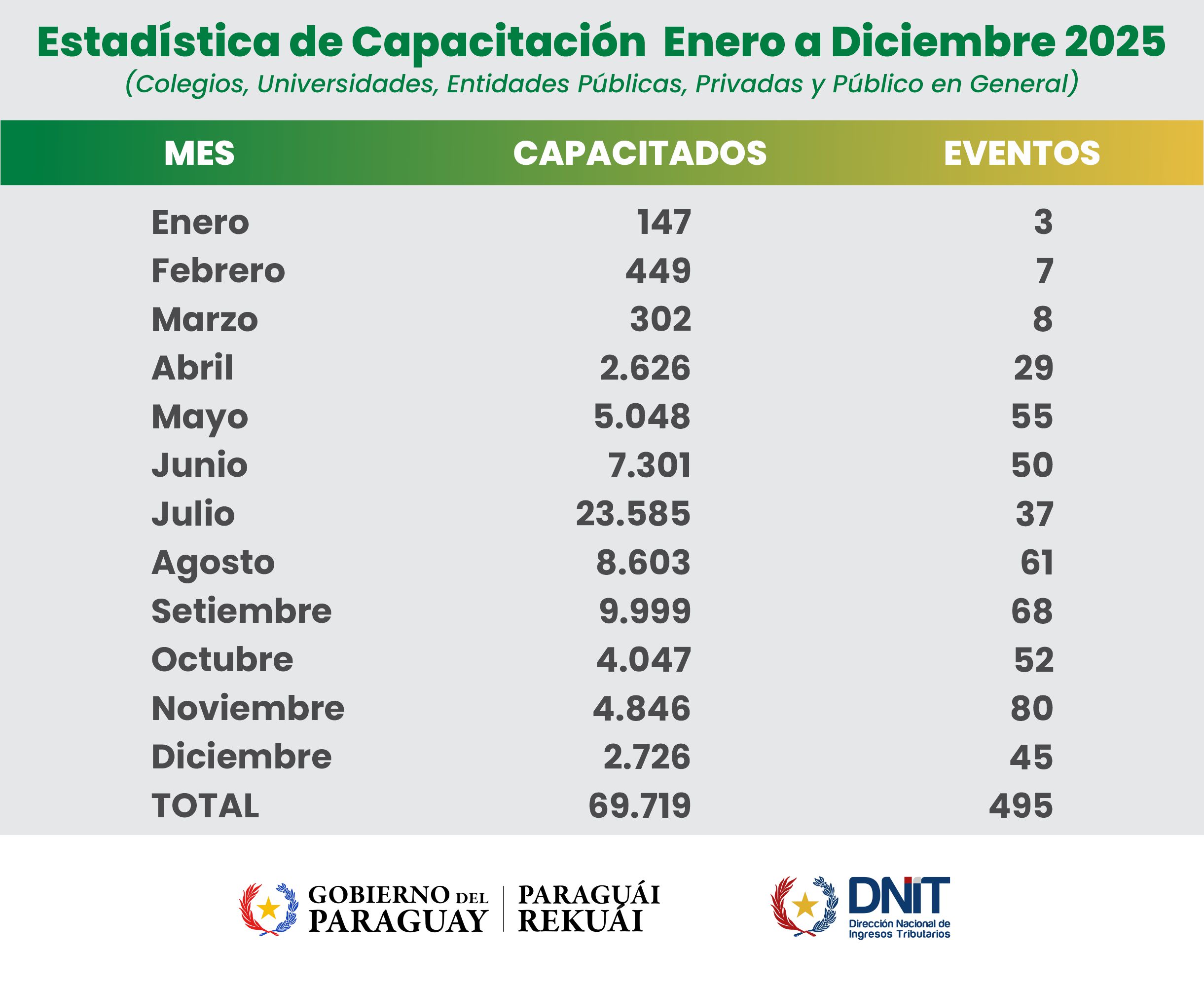 Estadística de Capacitación a Colegios, Universidades, Entidades Públicas, Privadas y Público en General Año 2025