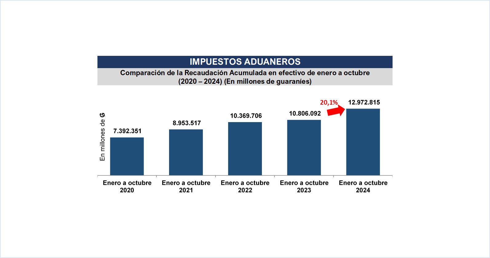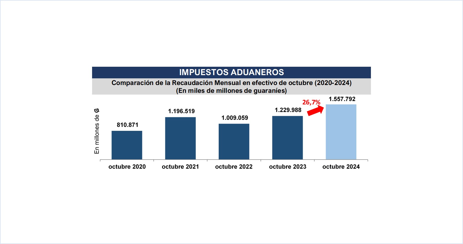 La Gerencia General de Aduanas por su parte registra un nuevo récord histórico en el mes de octubre pasado, con una recaudación en efectivo de ₲. 1.557.792 millones (USD 198 millones), obteniendo una variación interanual de 26,7% respecto al mismo mes del año anterior, equivalente a ₲ 327.804 millones (USD 42 millones) más.