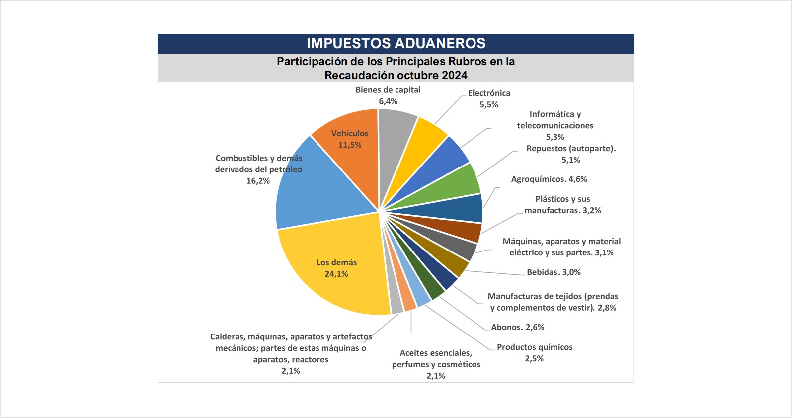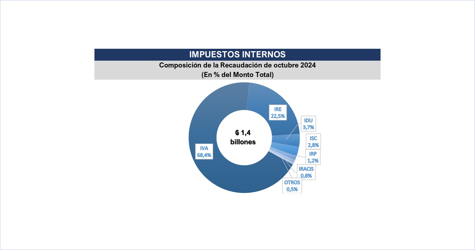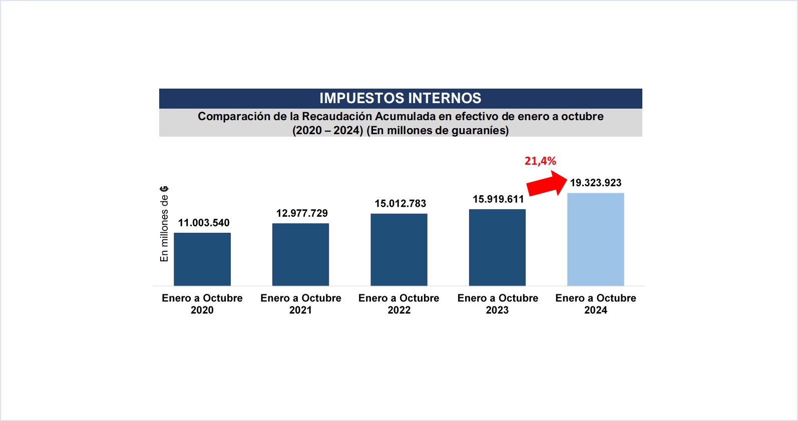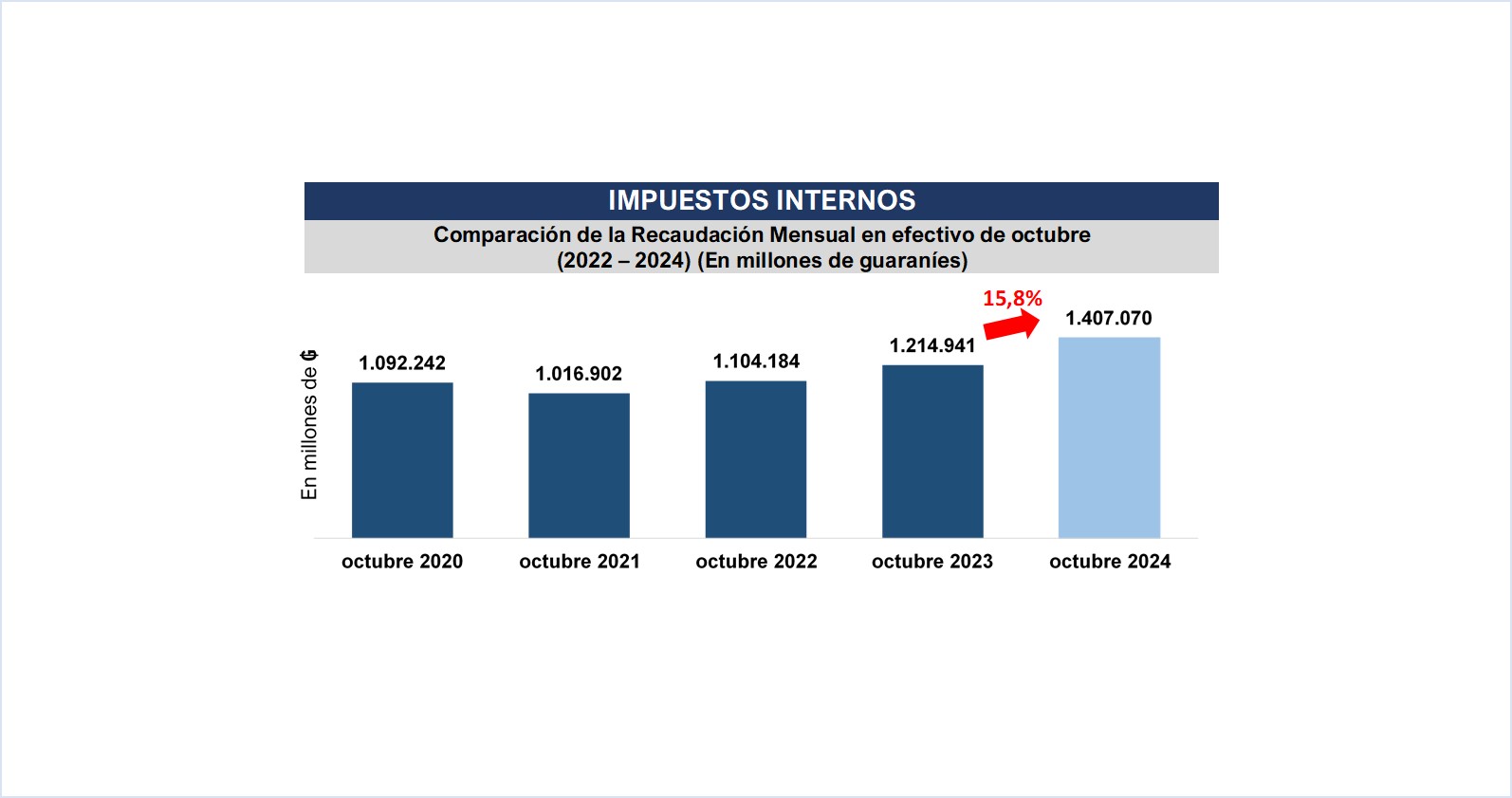 La Gerencia General de Impuestos Internos en el mes de octubre recaudó un total de ₲. 1.407.070 millones (USD 179 millones1), que representa una variación interanual de 15,8%, equivalente a ₲ 192.129 millones (USD 24,4 millones) más.