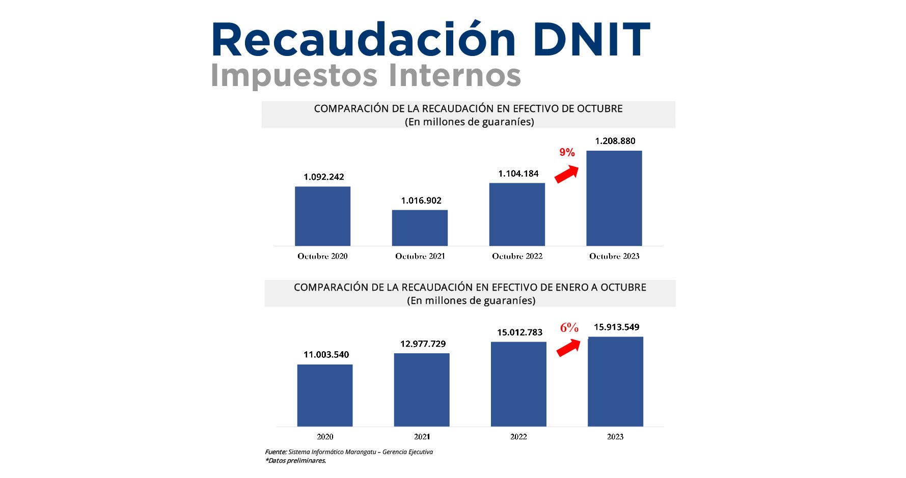 En el mes de octubre, la DNIT recaudó Gs. 2.485.617 millones (333 millones de USD), lo cual representa un crecimiento de 15,5% en comparación al mismo mes del año 2022.