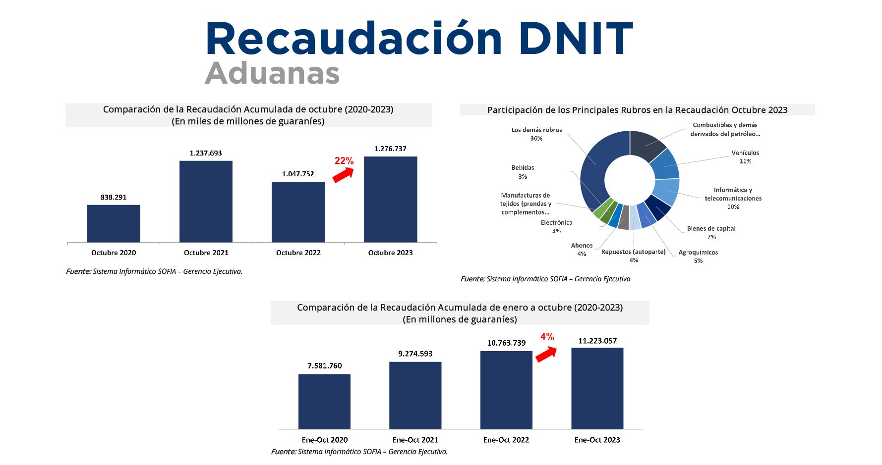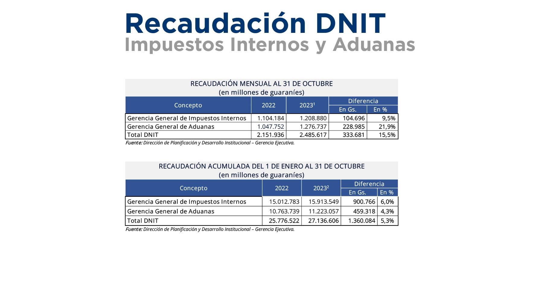 La DNIT logró un crecimiento positivo de 15,5% con relación al mismo período (octubre) del año 2022, considerando la recaudación consolidada de la Gerencia General de Impuestos Internos y la Gerencia General de Aduanas.