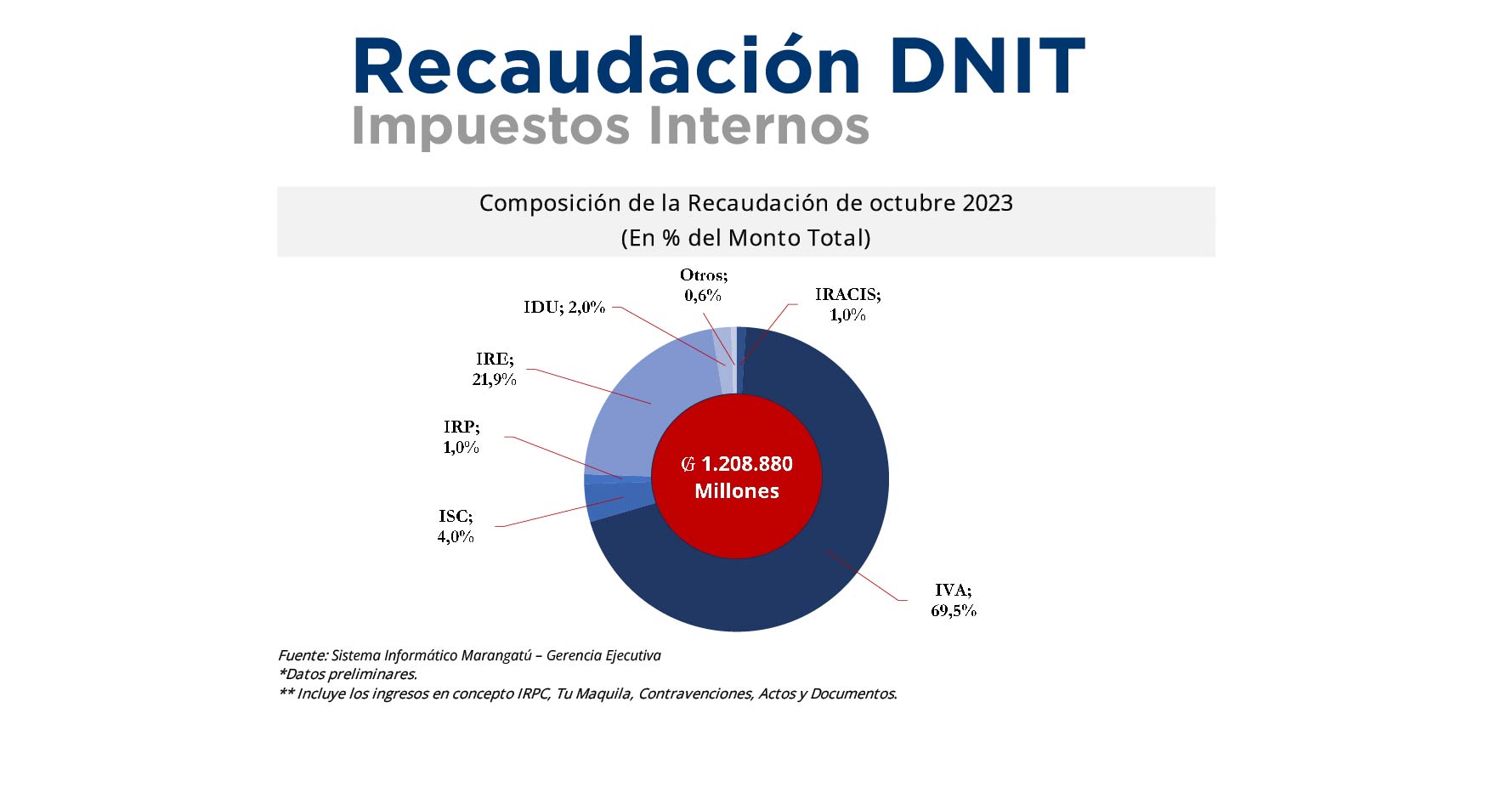 La Gerencia General de Impuestos Internos en el mes de octubre recaudó un total de Gs. 1.208.880 millones (162 millones de USD1), que representa una variación interanual de 9,5%.