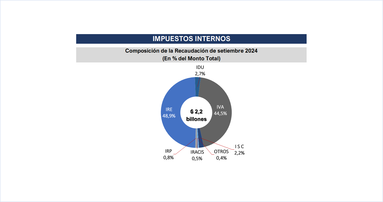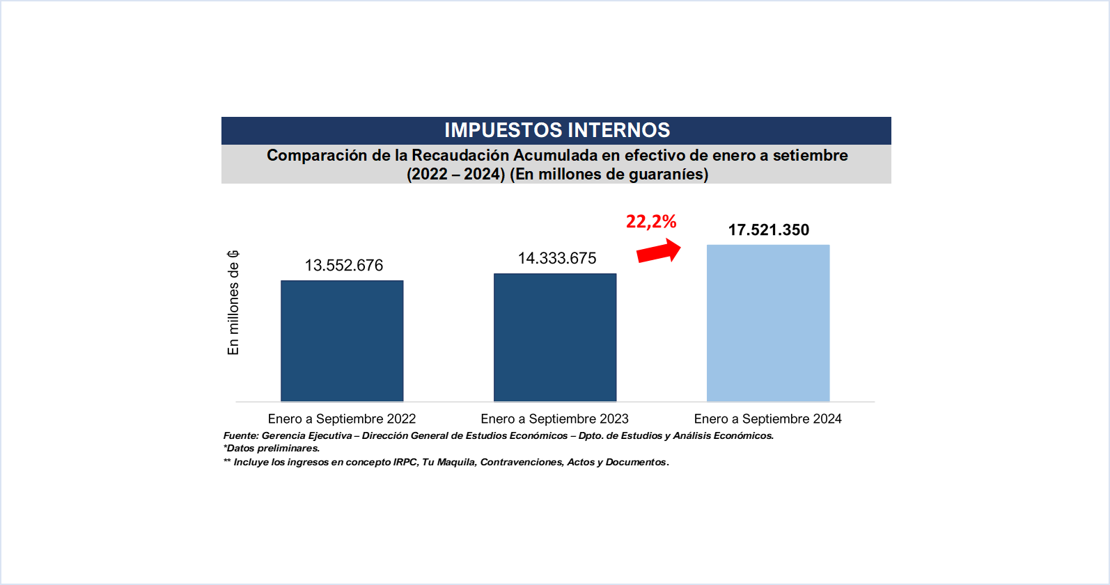 La Gerencia General de Impuestos Internos en el mes de setiembre recaudó un total de ₲. 2.189.074 millones (USD 281 millones), que representa una variación interanual de 16,6%, equivalente a ₲ 312.307 millones (USD 40,0 millones) más.