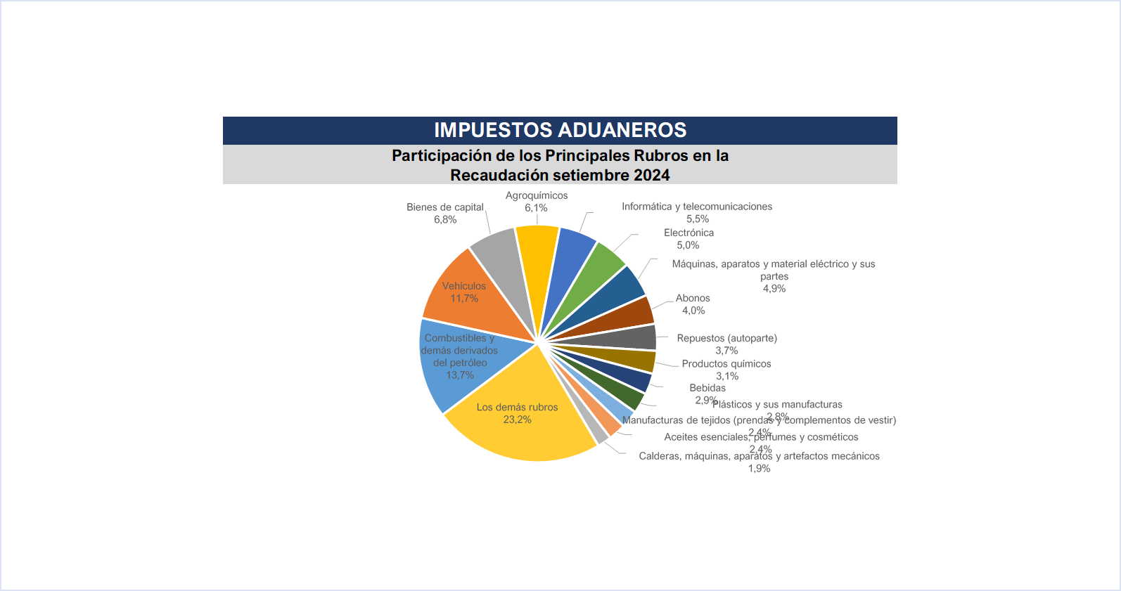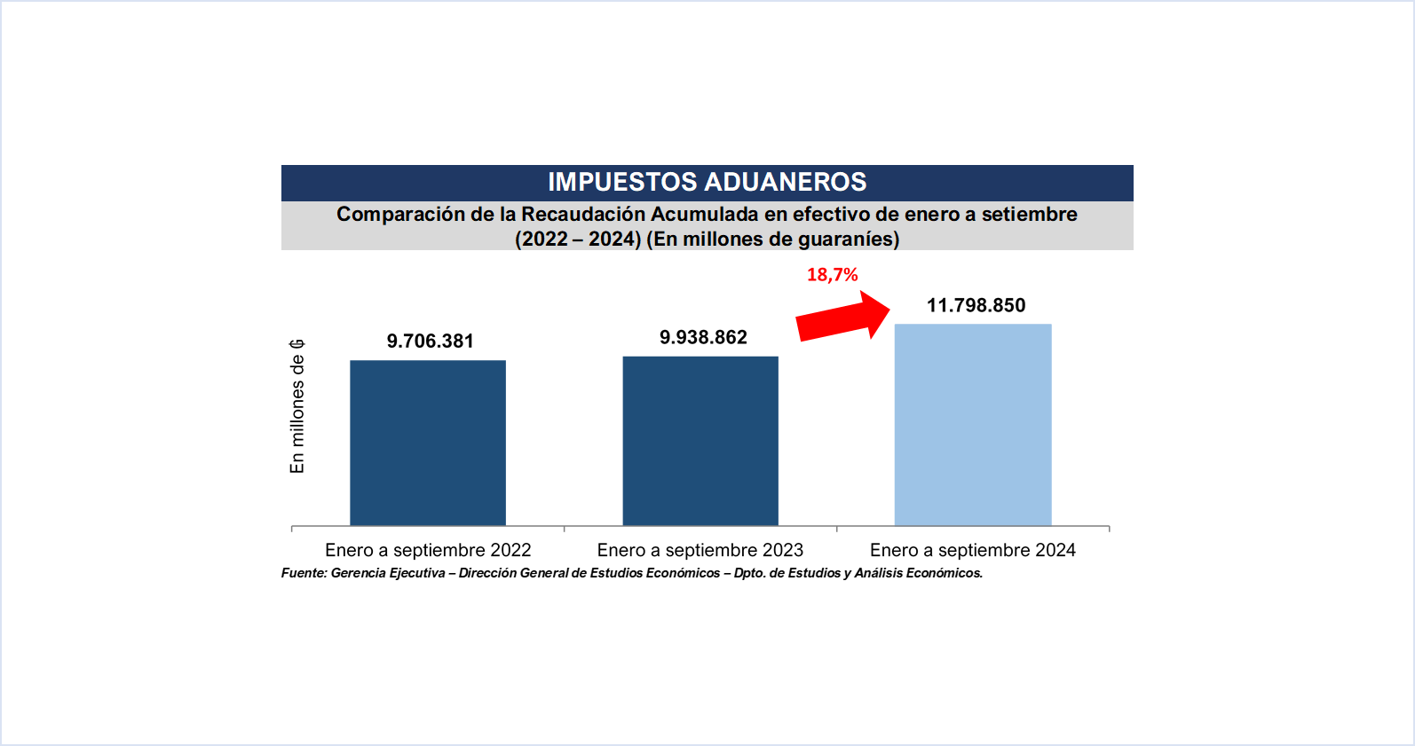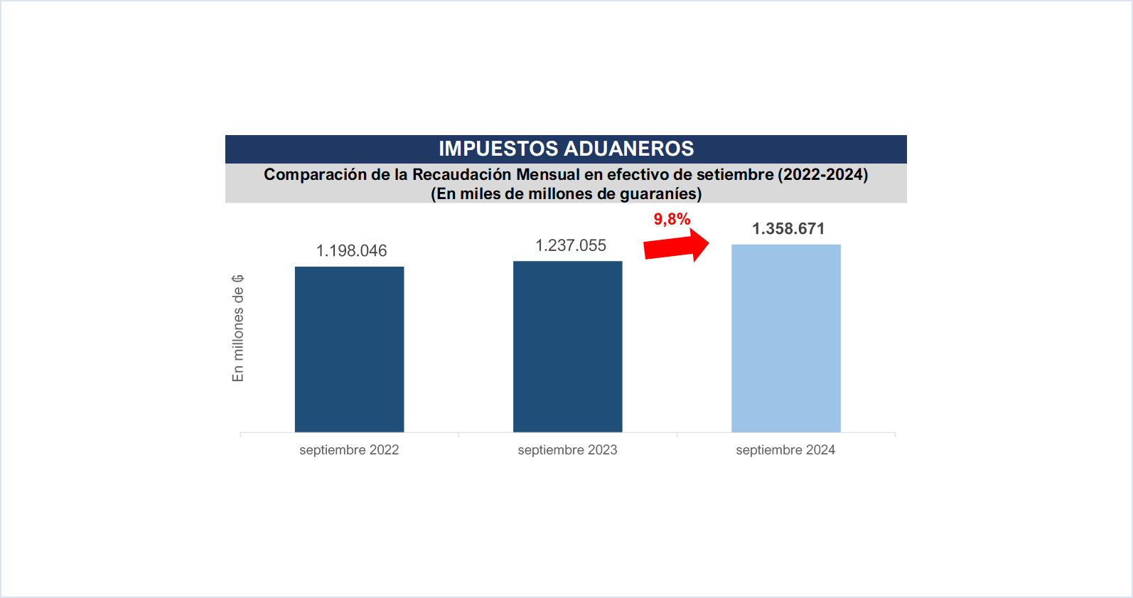 La Gerencia General de Aduanas por su parte registra en el mes de setiembre pasado una recaudación en efectivo de ₲. 1.358.671 millones (USD 174 millones), obteniendo una variación interanual de 9,8% respecto al mismo mes del año anterior, equivalente a ₲ 121.616 millones (USD 15,6 millones) más.