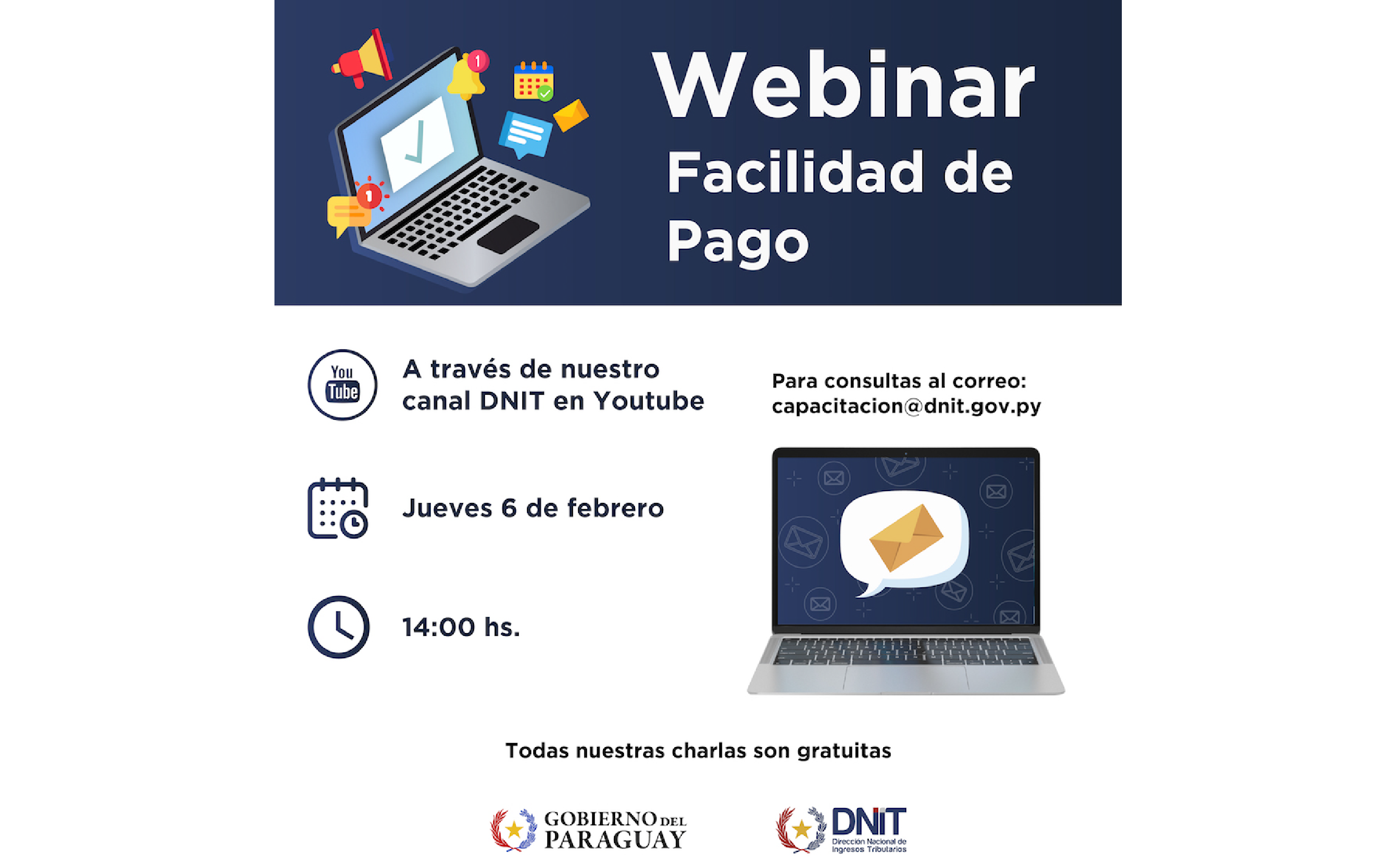 El Webinar se llevará a cabo el jueves 6 de febrero a las 14:00 horas a través del canal oficial en YouTube @dnitpy.