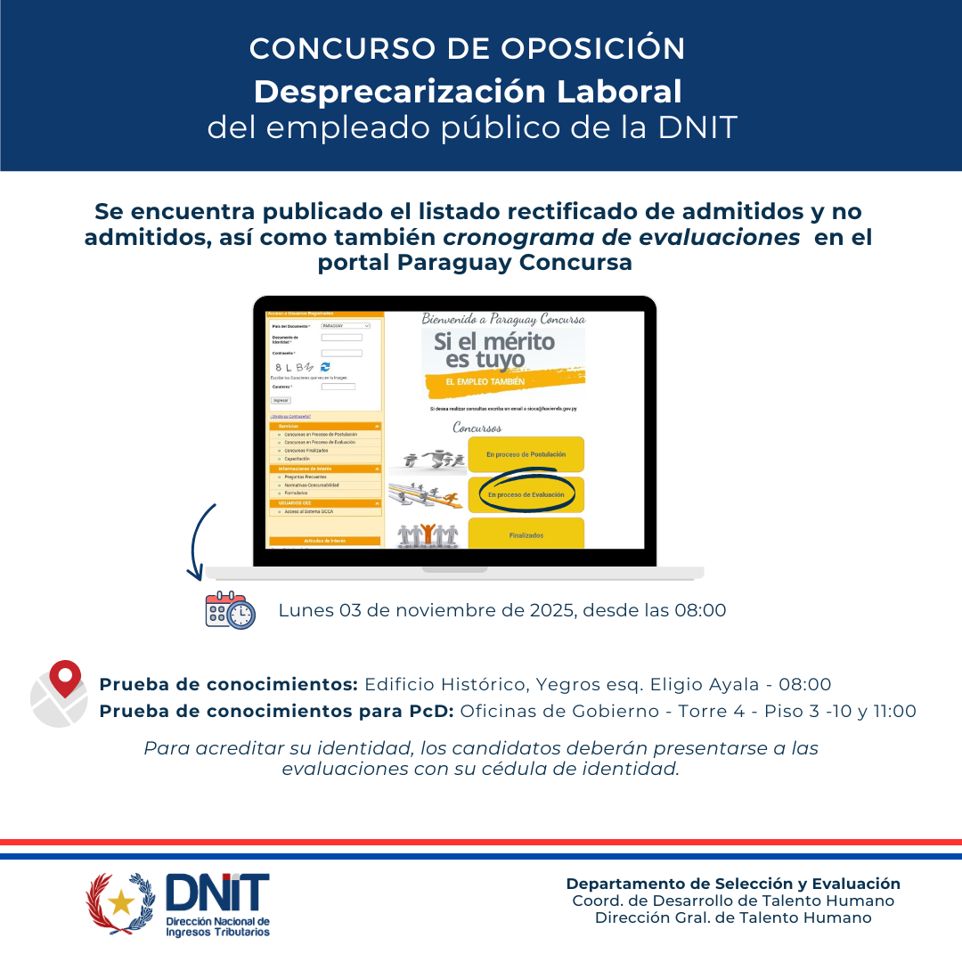 Se encuentra abierta la Convocatoria del Concurso Interno Institucional para la Desprecarización Laboral, dirigida exclusivamente a empleados públicos de la DNIT contratados con al menos 4 (cuatro) años de antigüedad en la institución al 31/12/2025, conforme a la declaración jurada de identificación de postulantes y a las bases y condiciones publicadas en el Portal Paraguay Concursa.