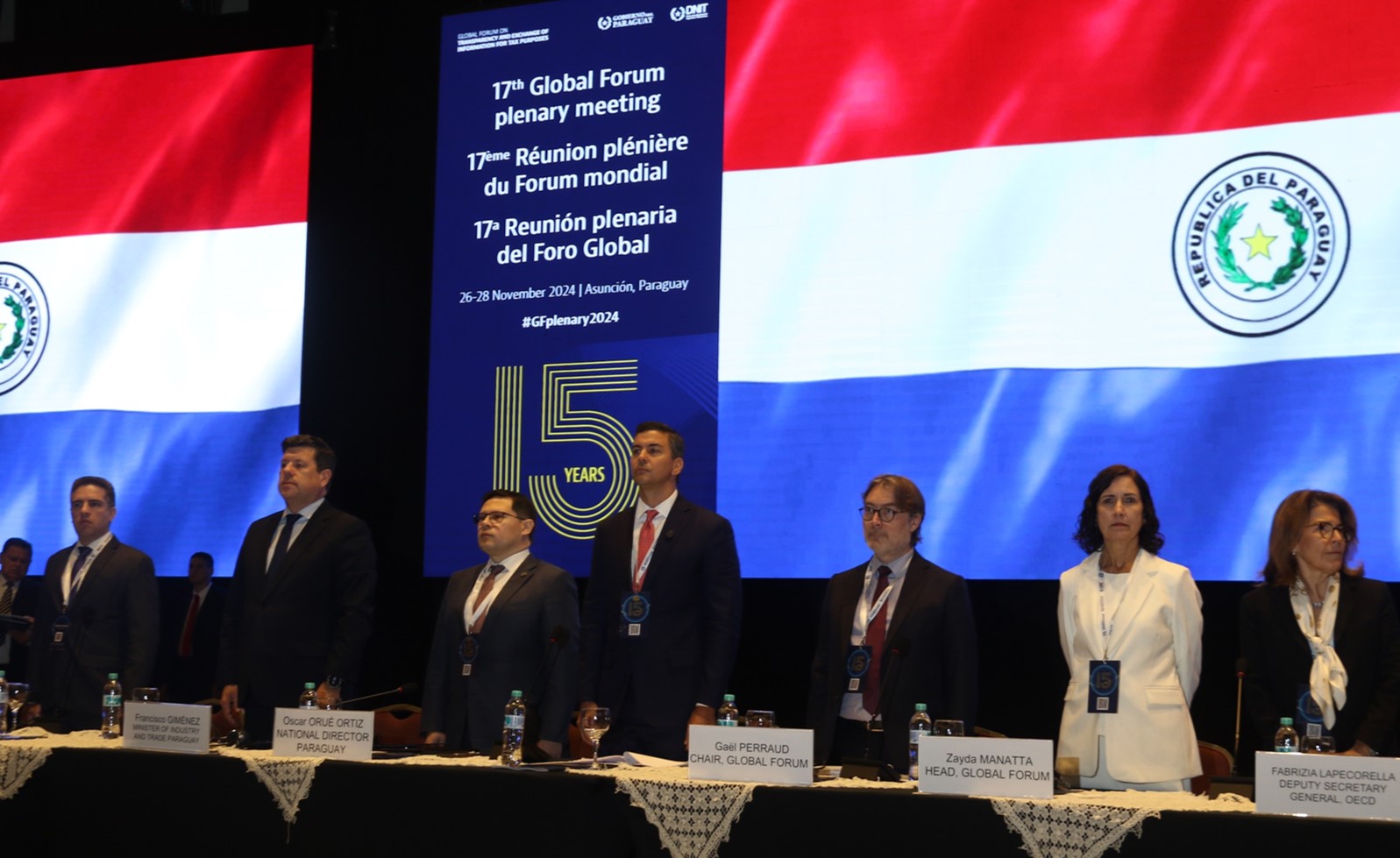 Con la presencia del Presidente de la República, Santiago Peña Palacios, se dio apertura ayer martes 26 de noviembre, a la "17ª Reunión Plenaria del Foro Global sobre Transparencia e Intercambio de Información con fines Fiscales y reuniones asociadas", en el Centro de Convenciones de la Conmebol. El evento, que continúa hasta el día viernes, cuenta con la presencia de más de 360 delegados provenientes de 116 jurisdicciones de la OCDE.