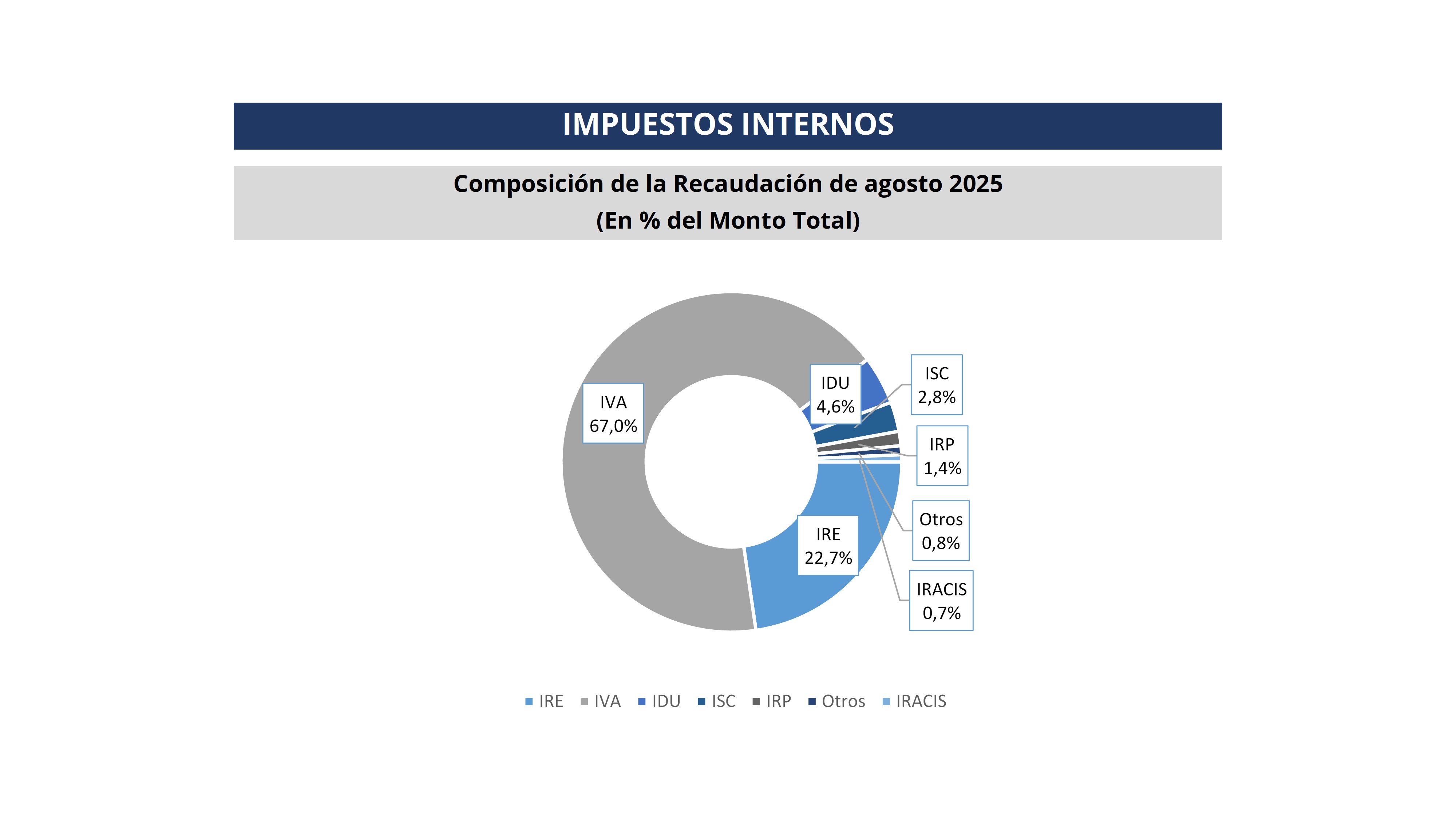 La Gerencia General de Impuestos Internos en el mes de agosto recaudó un total de ₲. 1.612.929 millones (USD 220,1 millones1), que representa una variación interanual de 20,6%, equivalente a ₲ 275.808 millones (USD 37,6 millones) más.