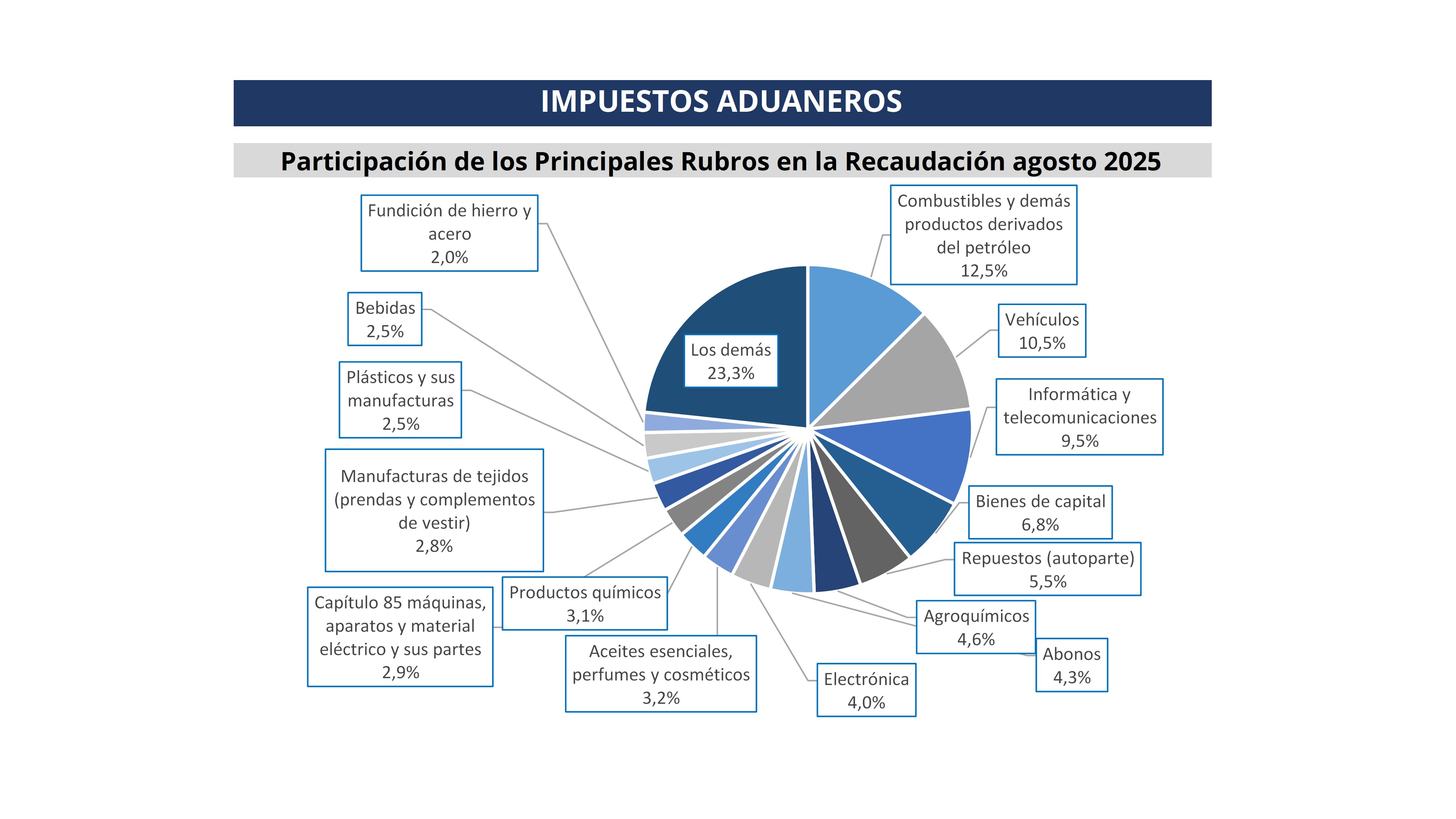 Con relación al crecimiento de la Recaudación de los Impuestos Aduaneros entre los rubros que incidieron positivamente en la recaudación se destacan: informática y telecomunicaciones; bienes de capital; aceites esenciales, perfumes y cosméticos; repuestos (autoparte); manufacturas de tejidos (prendas y complementos de vestir; capítulo 85 máquinas, aparatos y material eléctrico y sus partes, entre otros.