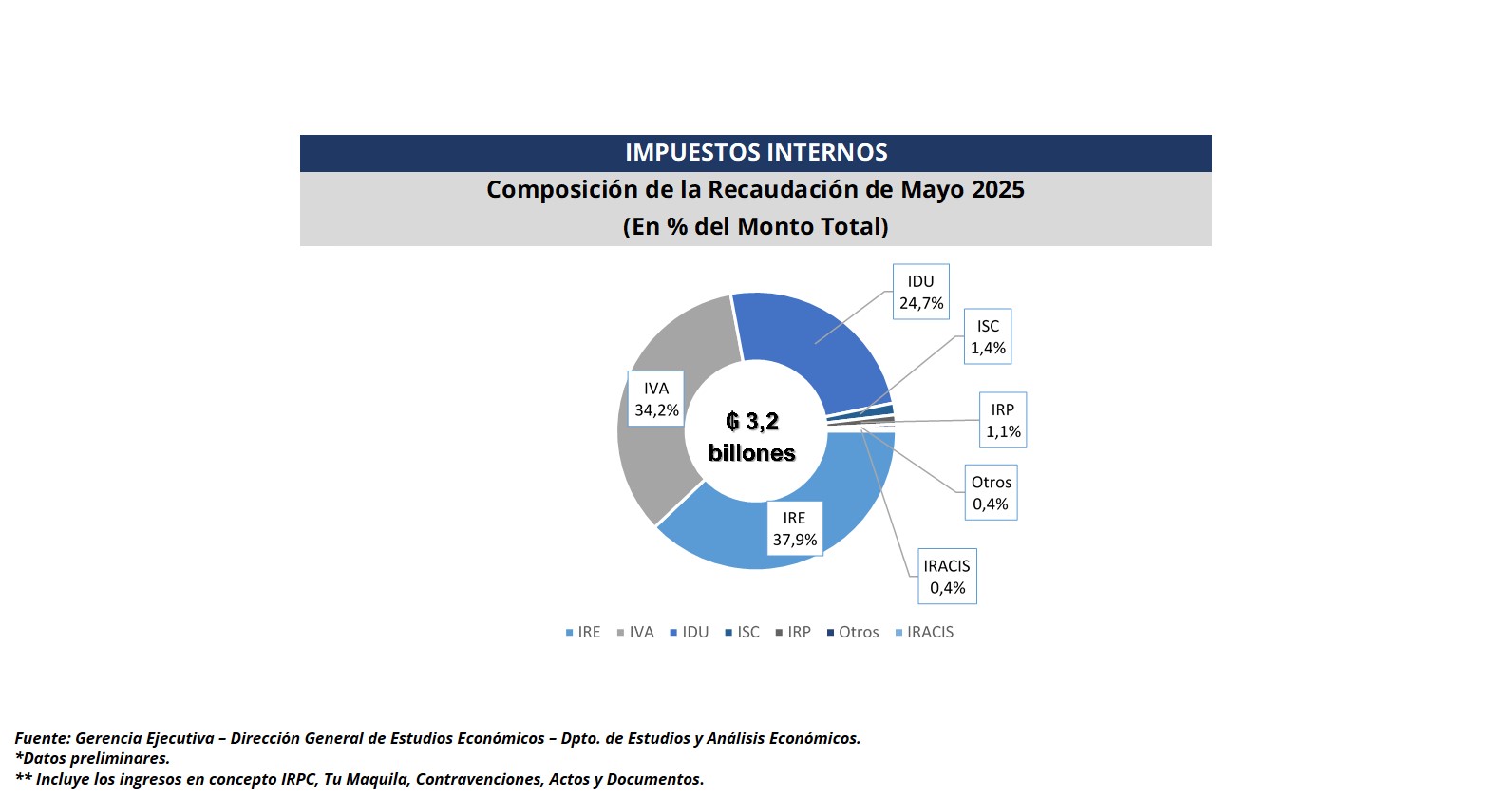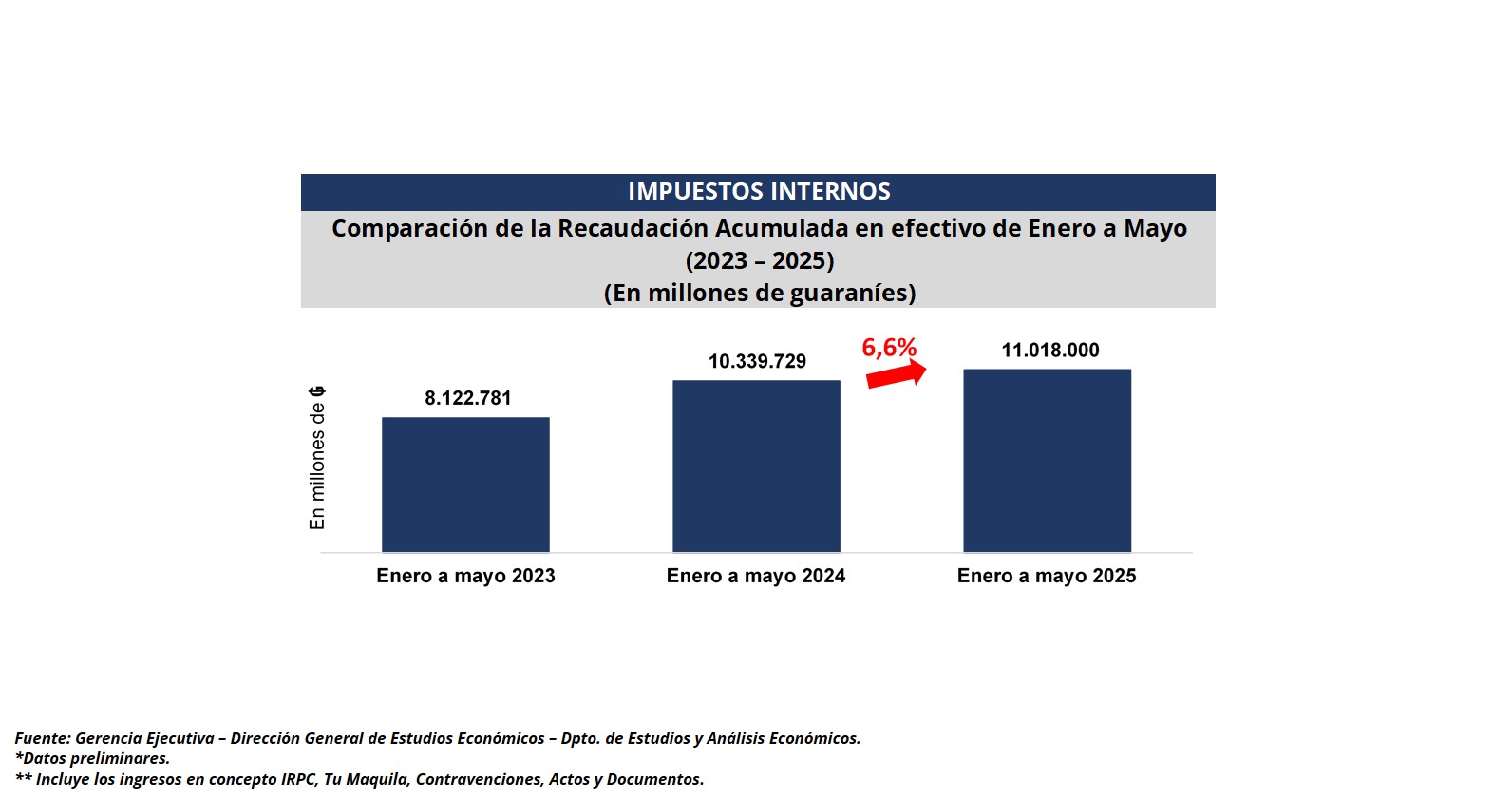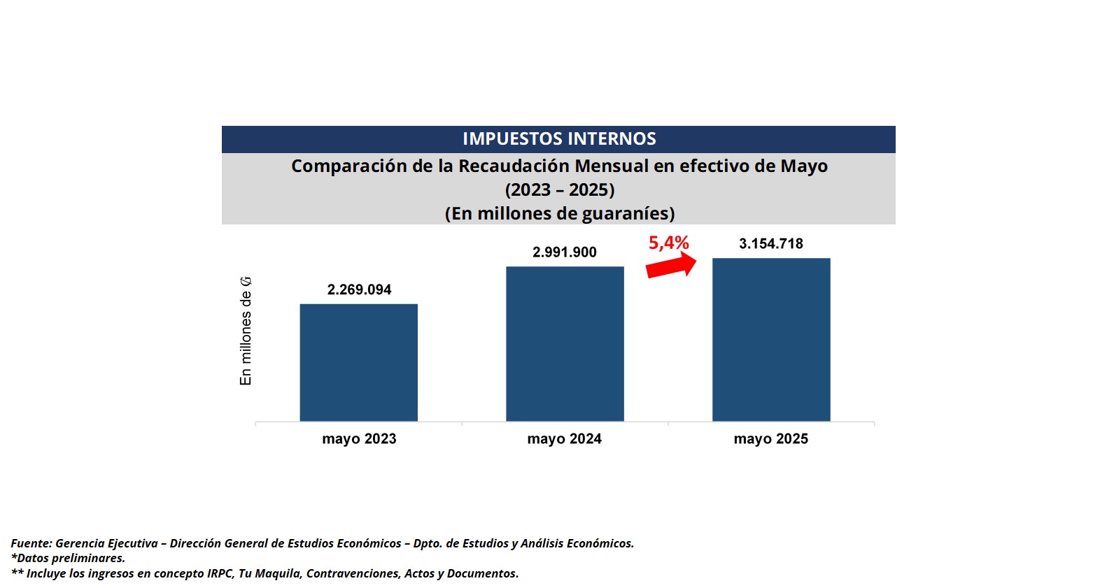 La Gerencia General de Impuestos Internos en el mes de mayo recaudó un total de ₲. 3.154.718 millones (USD 396 millones1), que representa una variación interanual de 5,4%, equivalente a ₲ 162.818 millones (USD 20,5 millones) más.