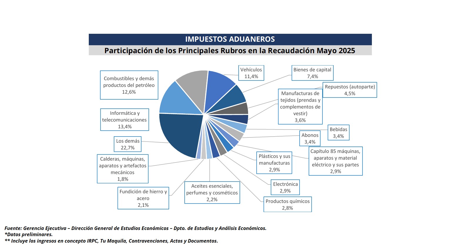 Con relación al crecimiento de la Recaudación de los Impuestos Aduaneros entre los rubros que incidieron positivamente en la recaudación se destacan: Informática y telecomunicaciones, Combustibles y demás productos derivados del petróleo y Vehículos.