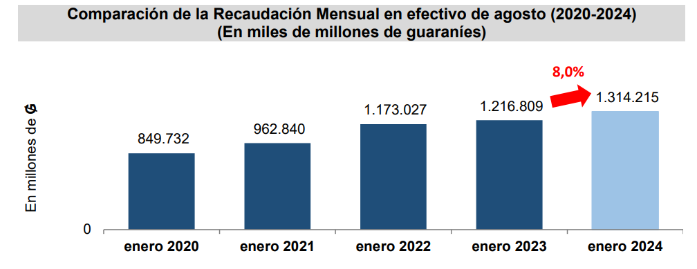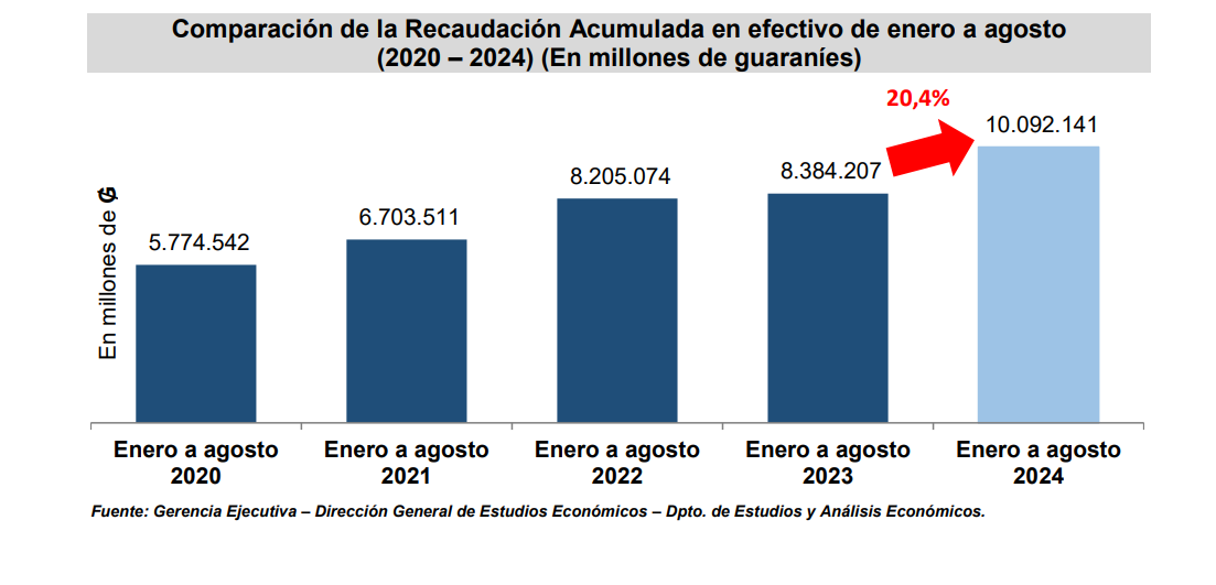 La Gerencia General de Aduanas por su parte registra en el mes de agosto pasado una recaudación en efectivo de ₲. 1.314.215 millones (USD 171 millones), obteniendo una variación interanual de 8,0% respecto al mismo mes del año anterior, equivalente a ₲. 97.407 millones (USD 12,7 millones) más.