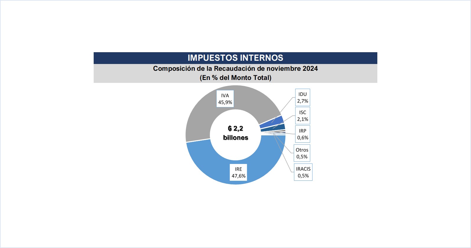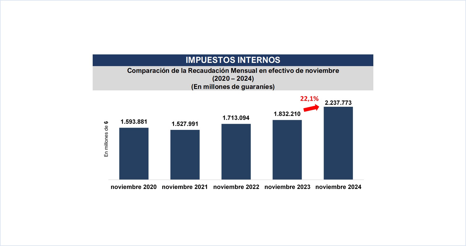 La Gerencia General de Impuestos Internos en el mes de noviembre recaudó un total de ₲. 2.237.773 millones (USD 287 millones), que representa una variación interanual de 22,1%, equivalente a ₲ 405.563 millones (USD 52,0 millones) más.