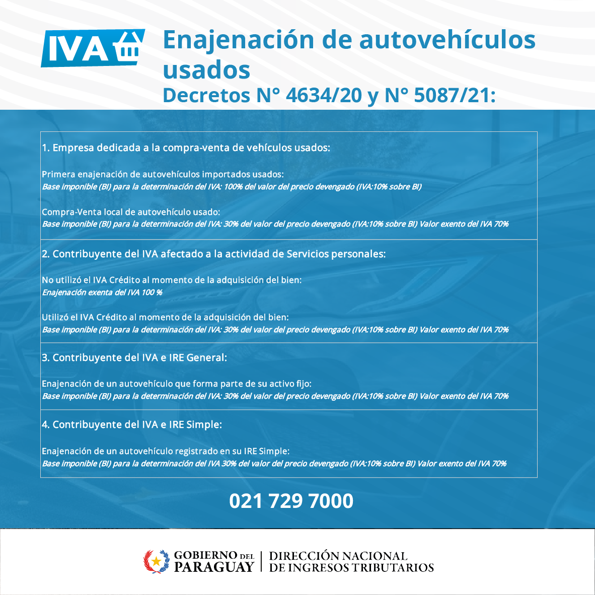 El Poder Ejecutivo emitió el Decreto N° 4634/2020 el cual establece un régimen especial de liquidación del Impuesto al Valor Agregado (IVA) en la enajenación autovehículos usados y prestación de servicios de reaseguros con el fin de facilitar el cumplimiento voluntario de las obligaciones tributarias por parte de los contribuyentes afectados.