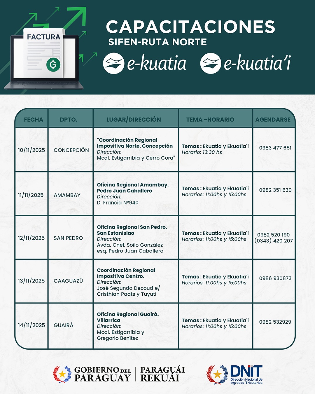 Capacitaciones sobre Facturación Electrónica del 10 al 14 de noviembre en las ciudades de Concepción, Amambay, San Pedro, Caaguazú y Guairá.