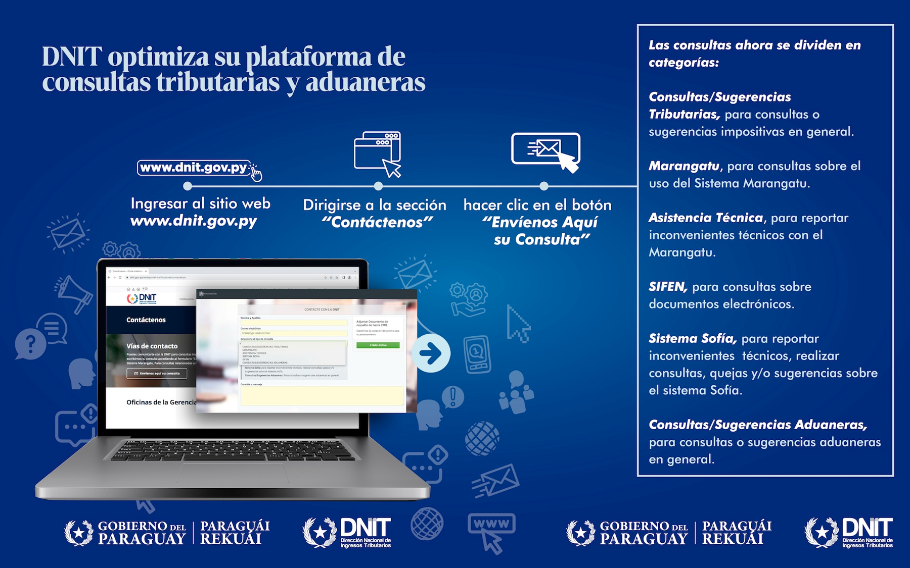 La Dirección Nacional de Ingresos Tributarios (DNIT), durante el año 2025, ha canalizado y respondido más de 48.000 mensajes a través de la herramienta digital “Contáctenos”, uno de los canales oficiales de atención y comunicación de la institución.