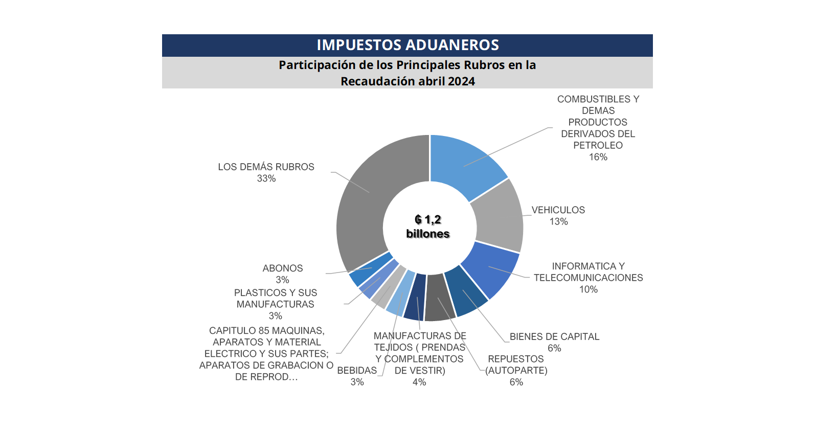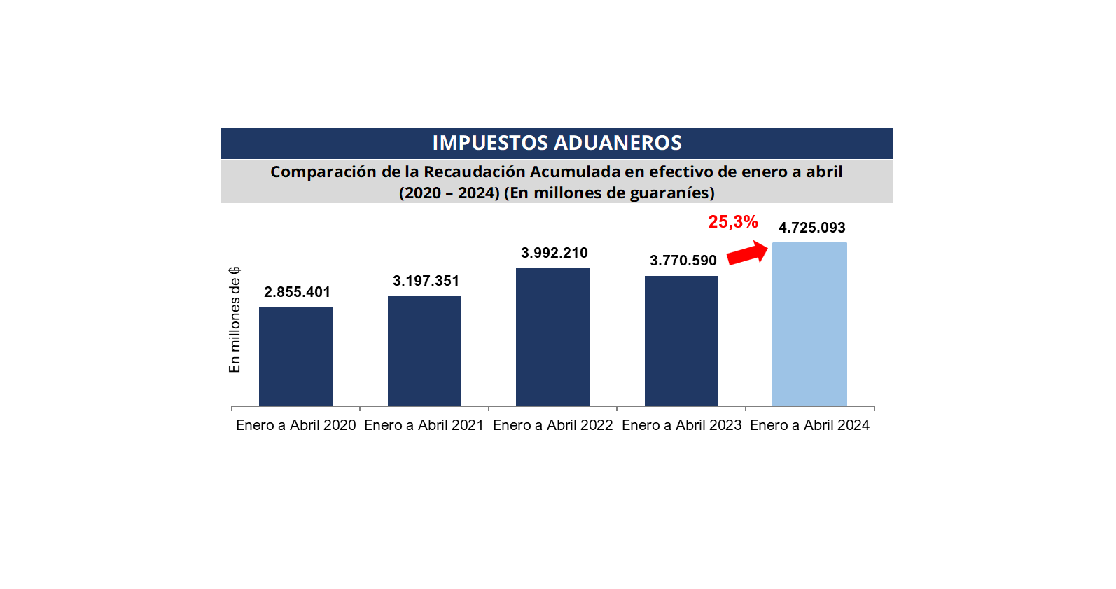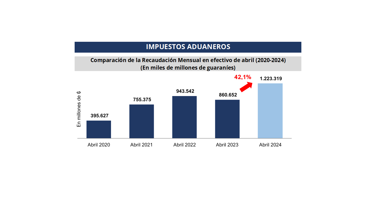 La Gerencia General de Aduanas por su parte registra en el mes de abril pasado una recaudación en efectivo de ₲. 1.223.319 millones (USD 163 millones), obteniendo una variación interanual de 42,1% respecto al mismo mes del año anterior, equivalente a ₲ 362.667 millones (USD 48,4 millones) más.