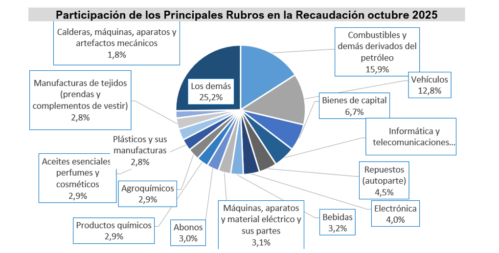 Con relación al crecimiento de la Recaudación de los Impuestos Aduaneros entre los rubros que incidieron positivamente en la recaudación se destacan la importación de vehículos; productos químicos; bienes de capital; y derivados del Petróleo, lo que generó un refuerzo en el crecimiento de la recaudación de los impuestos al comercio exterior.