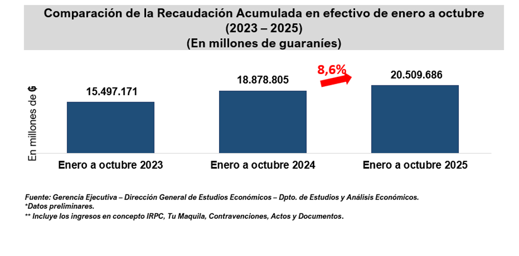 En términos de recaudación total acumulada de enero a octubre, se generó un crecimiento de 9,7%, que representa un monto total de ₲. 3.127.962 millones más que en el mismo periodo del 2024, conforme se puede observar en el Cuadro 2: