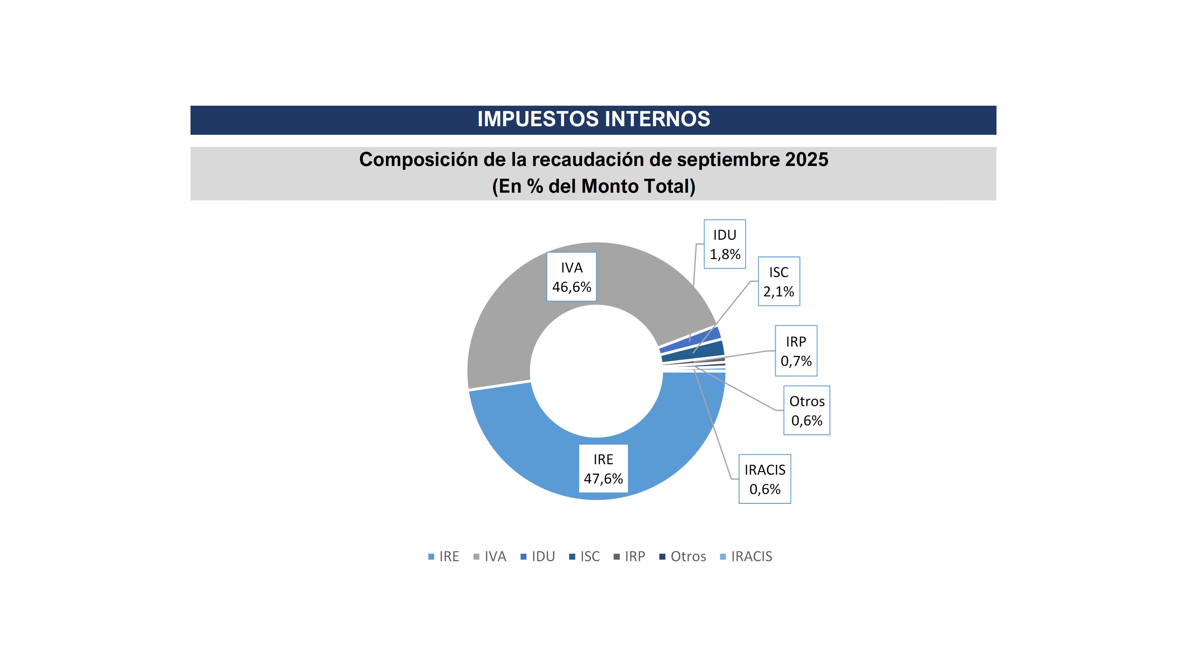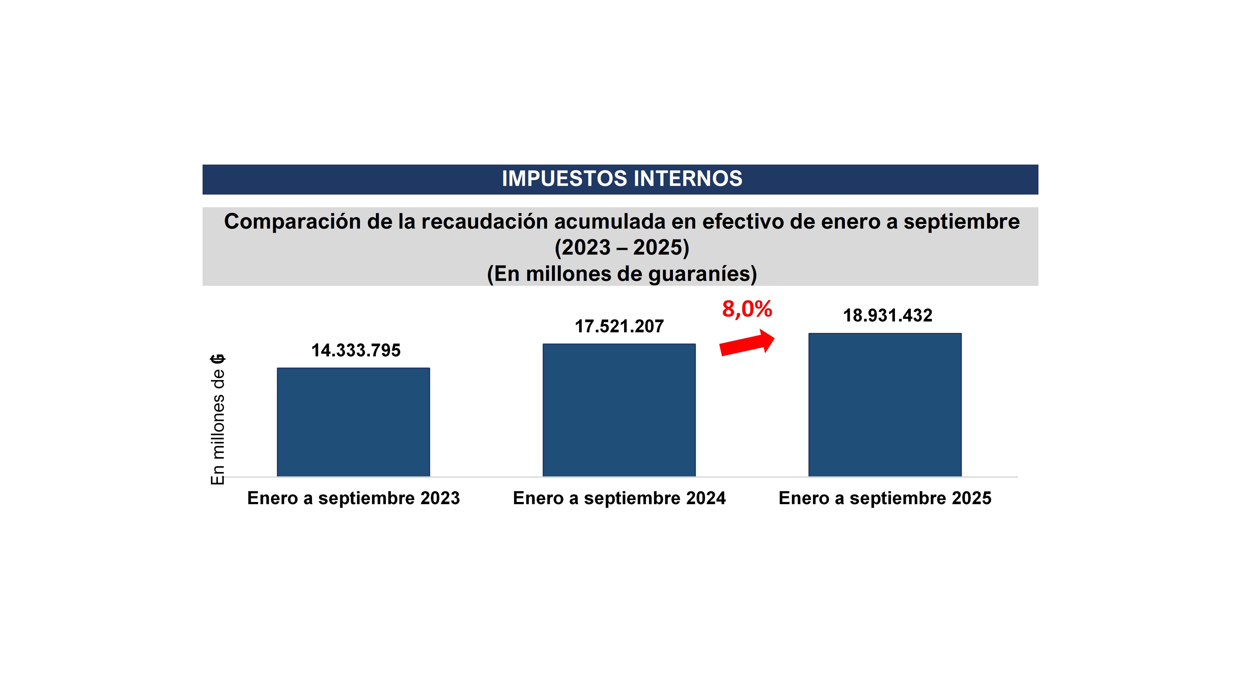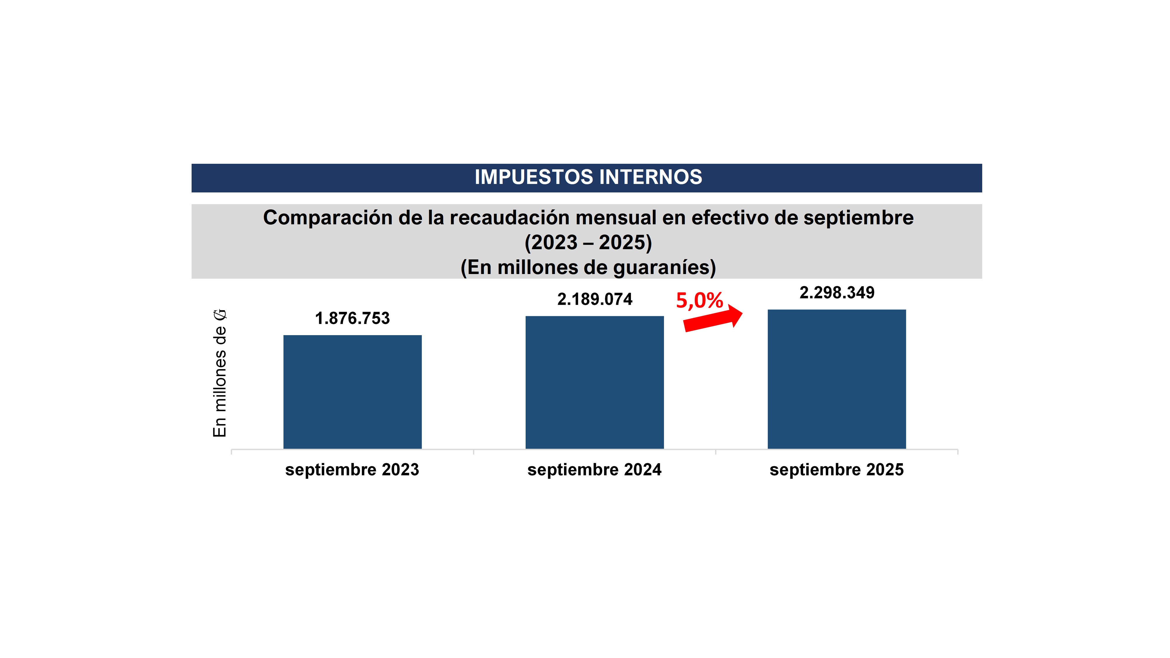 La Gerencia General de Impuestos Internos en el mes de septiembre recaudó un total de ₲. 2.298.349 millones (USD 328,2 millones), que representa una variación interanual de 5,0%, equivalente a ₲ 109.275 millones (USD 15,6 millones) más.