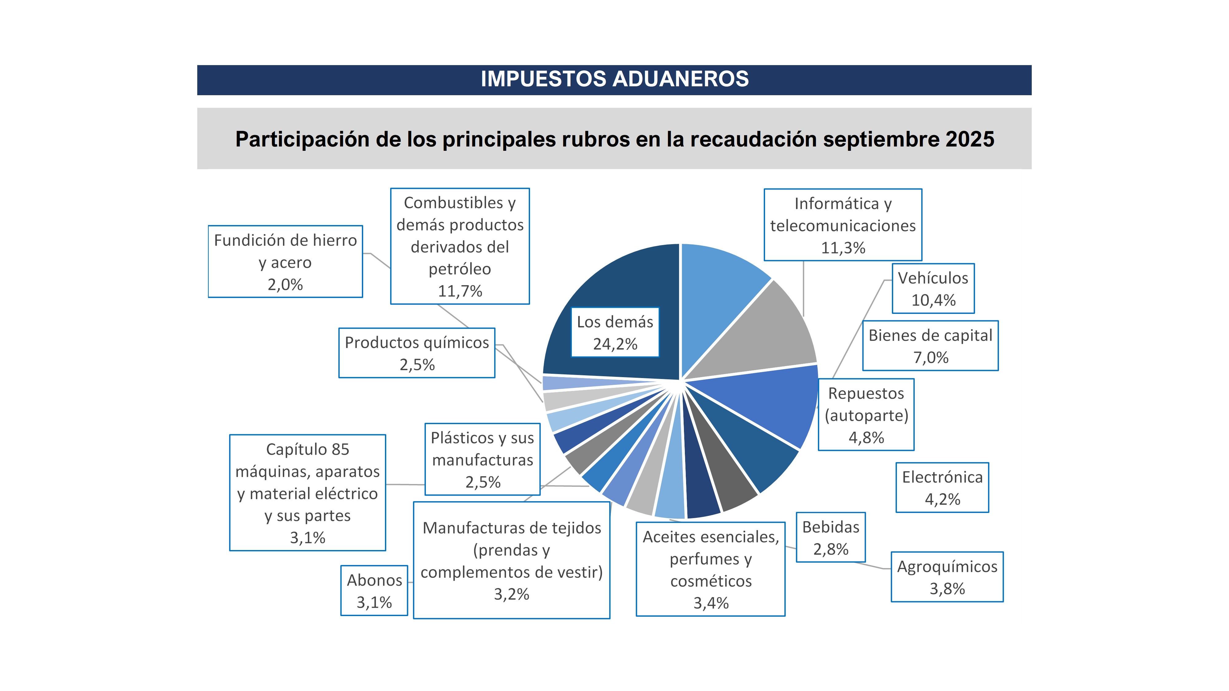 Con relación al crecimiento de la recaudación de los Impuestos Aduaneros, entre los rubros que incidieron positivamente en la recaudación se destacan: informática y telecomunicaciones; aceites esenciales, perfumes y cosméticos; repuestos (autoparte); bienes de capital; vehículos; fundición de hierro y acero; manufacturas de tejidos (prendas y complementos de vestir; entre otros.