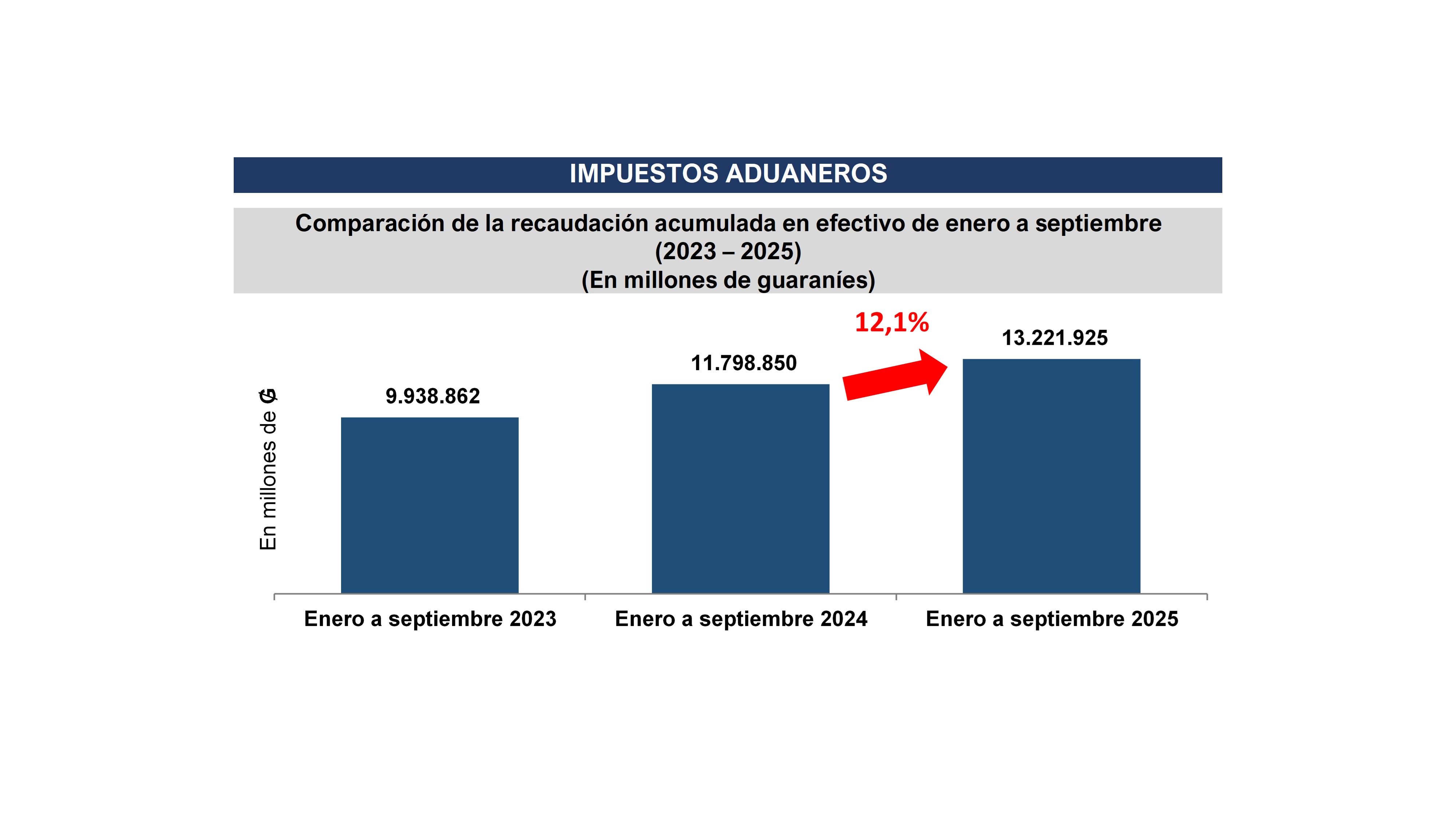 La Gerencia General de Aduanas por su parte en el mes de septiembre alcanzó una recaudación en efectivo de ₲. 1.518.149 millones (USD 216,8 millones), obteniendo una variación interanual de 11,7% respecto al mismo mes del año anterior, equivalente a ₲ 159.478 millones (USD 22,8 millones) más.