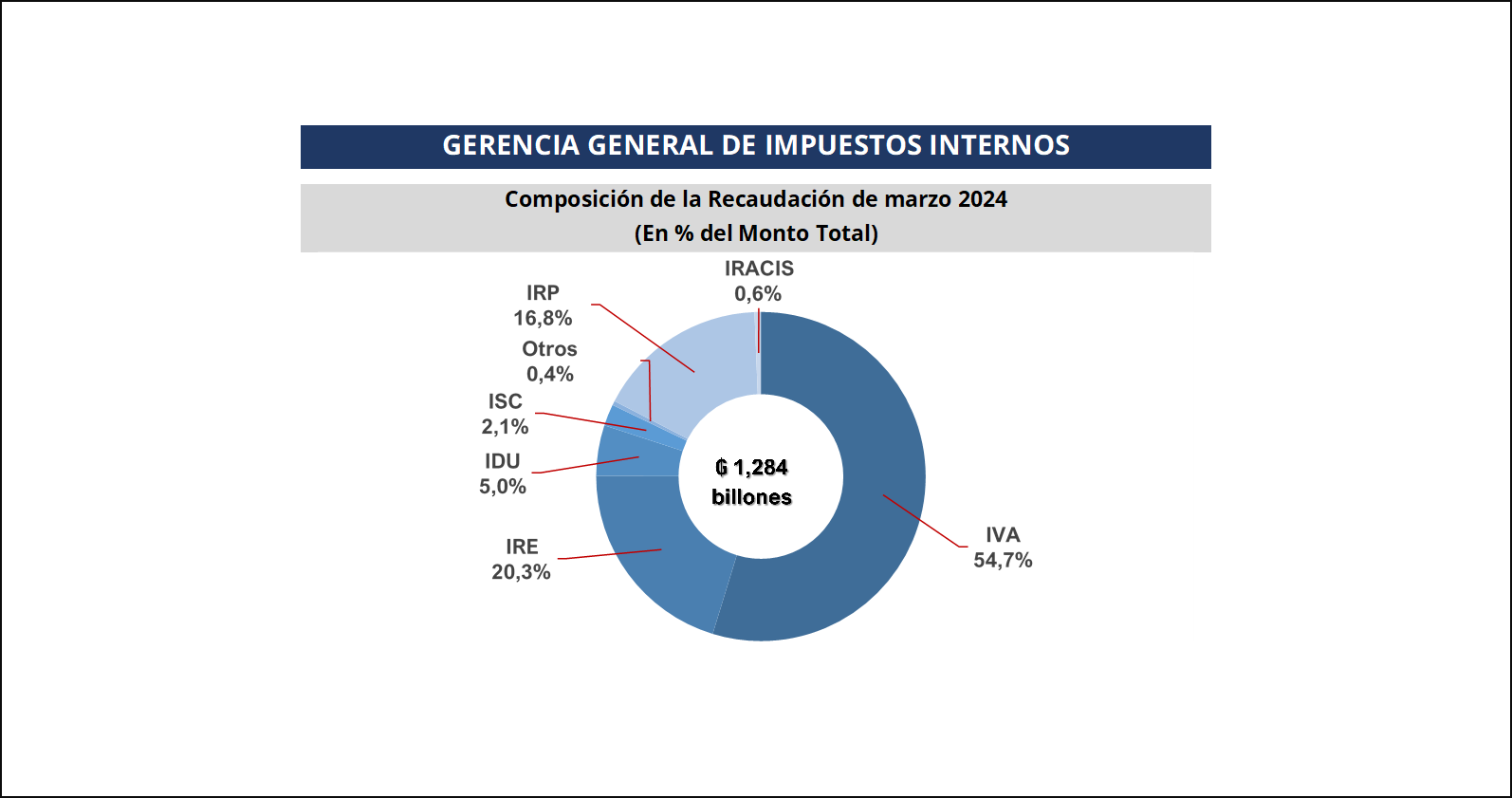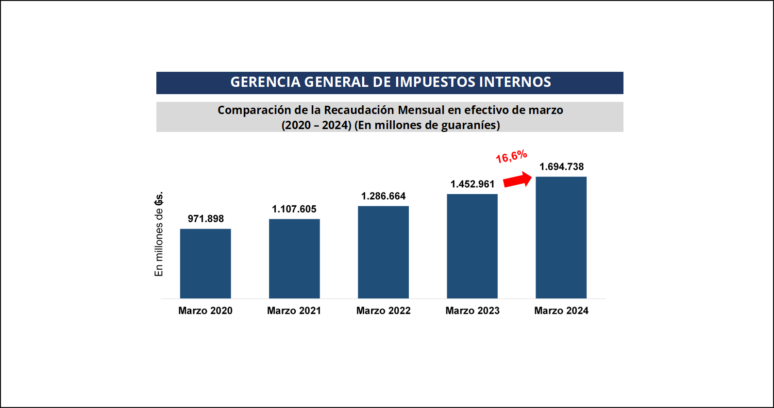 La Gerencia General de Impuestos Internos en el mes de marzo recaudó un total de ₲. 1.697.738 millones (USD 229 millones), que representa una variación interanual de 16,6%, equivalente a ₲ 241.777 millones (USD 32,7 millones) más.