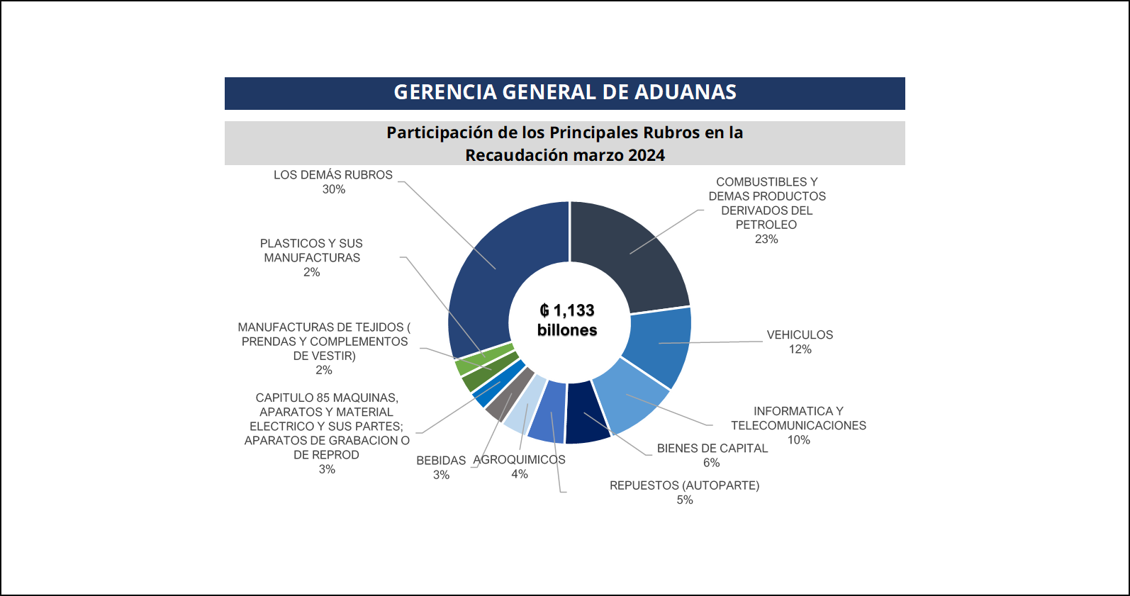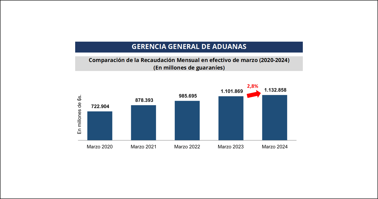 La Gerencia General de Aduanas por su parte registra en el mes de marzo una recaudación en efectivo de ₲. 1.132.858 millones (USD 153 millones), obteniendo una variación interanual de 2,8% respecto al mismo mes del año anterior, equivalente a ₲ 30.989 millones (USD 4,2 millones) más. Cabe resaltar que se obtuvo un rendimiento positivo a pesar de contar con cinco días hábiles menos en el mes de marzo y de factores exógenos como ser los problemas de vialidad que afectó al transporte de carga en los pasos fronterizos de la República de Chile.